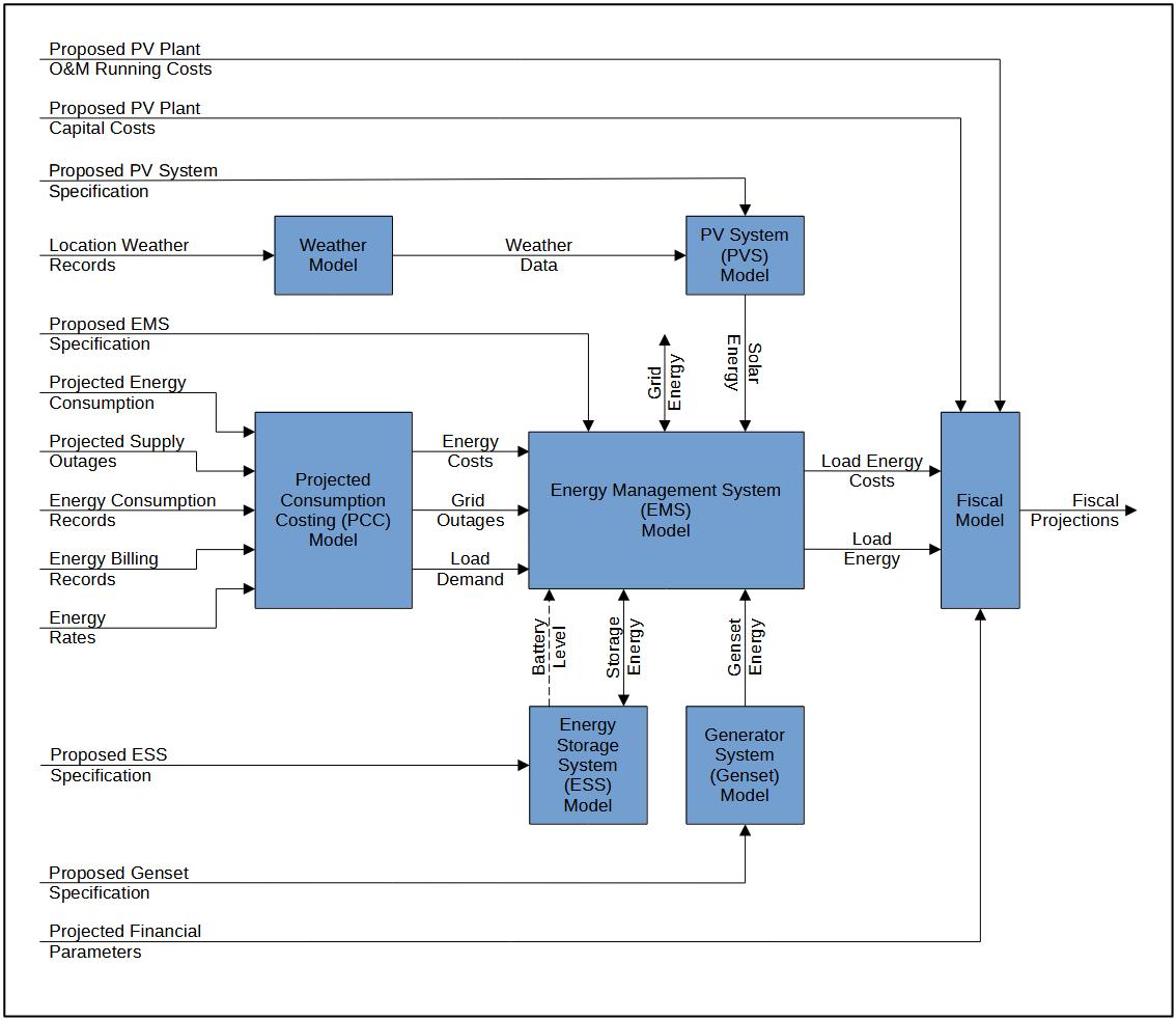The Fiscal model uses the Load Energy and associated costs to calculate a time-series cost of energy production. This information is compared with the cost of Load Demand supplied totally from grid and existing genset, or estimated costs associated with outages. This information is further processed against PV Plant CapEx and OpEx, and projected financial parameters to produce a cost and saving financial profile for the first year of operation.