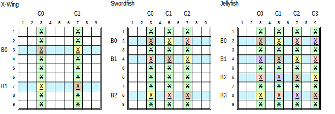 Consider the Jellyfish pattern with Candidate X in the right puzzle in the above figure. Rows 1, 3, 5 and 7 are base sets with between two and 4 occurrences of Candidate X. The Jellyfish pattern is recognised by the corresponding four column cover sets, each intersecting between 2 and 4 base-sets on the X candidate. The image shows a minimal Jellyfish with dark X’s in blue and yellow cells; where there are two candidates in each base set and two cover-set intersections (the yellow and blue cells). The presence of The light X candidates in the orange and magenta cells does not influence the outcome of this pattern. What is important to the Jellyfish pattern is that the union of intersecting Candidates in all base-sets must equal 4.