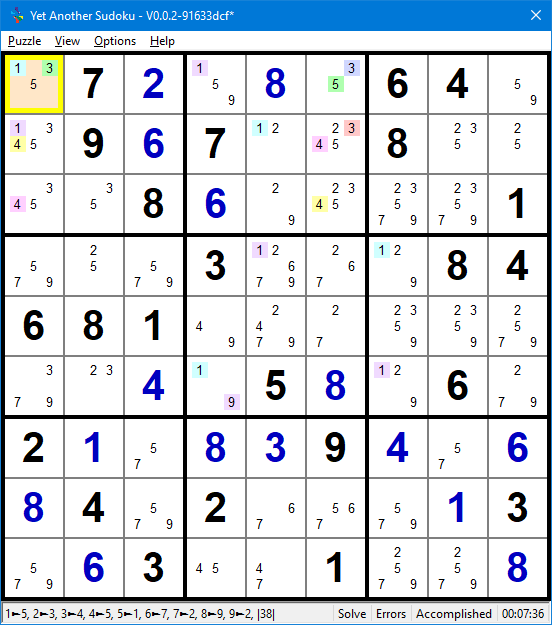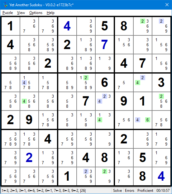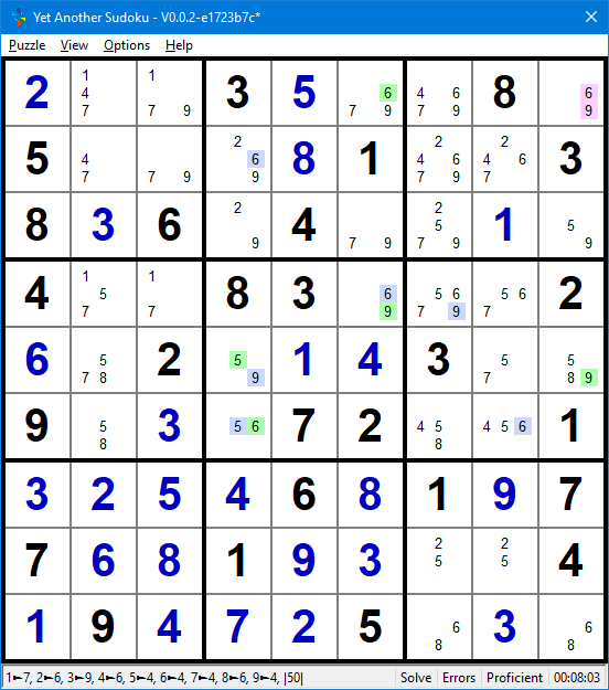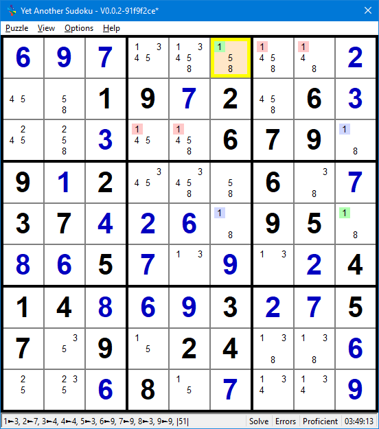 The net found in YAS is exactly the same pattern as the simple chain Hoduku finds. It is described differently because it starts at the third node that Hoduku finds, therefore starts with two nodes. To illustrate this example odd nodes are green, even nodes are blue. Any value in the pair (2 or 8) that can see both a blue and a green highlight can be eliminated. 3.4.3. AI-Chains and -Loops and -Nets AI- (Alternating Inference) Chains and loops is the most generalized linking of which X-Chains/Loops and XY-Chains/Loops are subsets. AIC’s are formed by linking any ccell nodes by alternating strong and weak links (keeping in mind that a strong link can masquerade as a weak link, but a weak link cannot masquerade as a strong link. See Links and Chains Logic above.