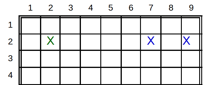 SLN1e = {3r1c1, 5r1c6} SLN1o = {3r1c6} SLN2e = {1r1c1, 1r6c4, 1r4c7, 1r2c5} SLN2o = {1r1c4, 1r6c7, 1r4cp, 1r2c1, 2r2c5, 9r6c4} SLN3e = {4r2c1, 4r3c6} SLN3e = {4r2c6, 4r3c1}