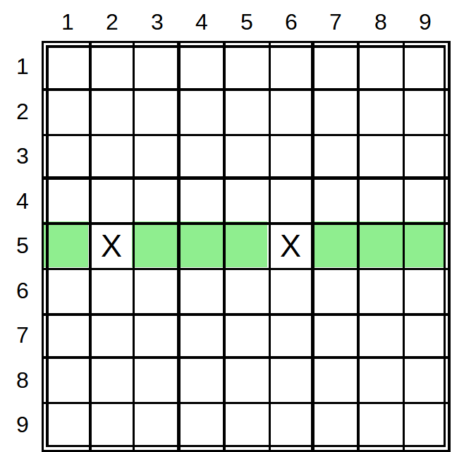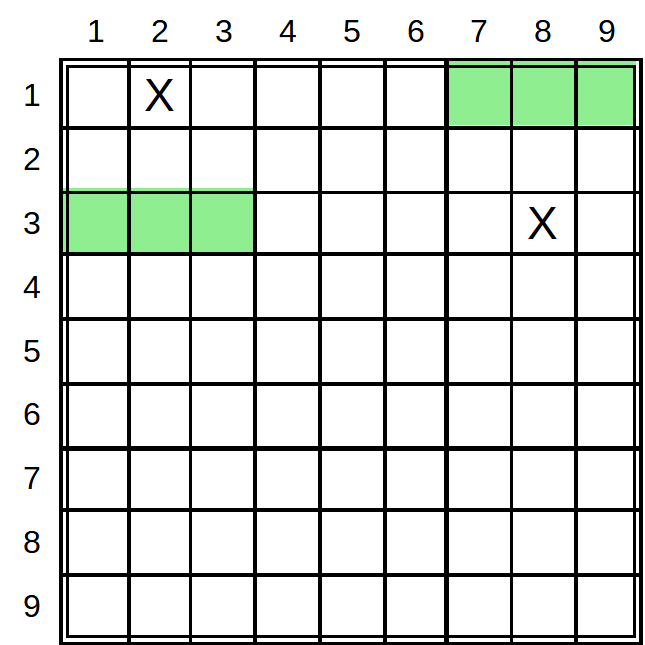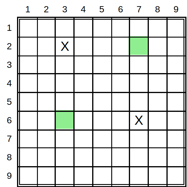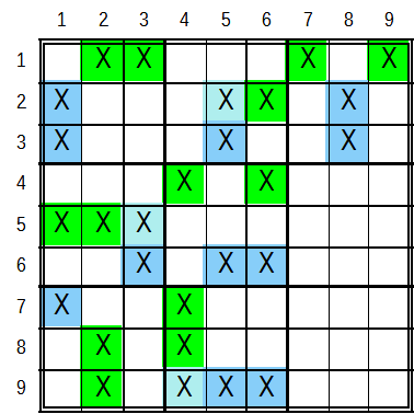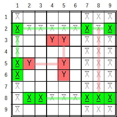 With ends in the Same House, seven cells can see both ends. In the figure on the right, hypothetical chain ends are marked X and the cells that can see both ends are highlighted green. Any same valued Ccell in the highlighted green cells cannot be True and can be eliminated.