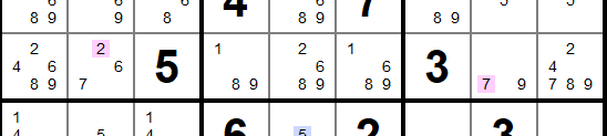 By the way with the puzzle in it’s current state, it is also possible to identify other patterns. There are two – two string kites. 8(r1c7=r1c9-r3c7=r9,c7) resulting in r9c6-=8, and 8(r8c3=r8c9-r9c7=r3c7) resulting in r3c3-=8. There is also a Swordfish 8r128c369, resulting in the same eliminations as the 6 link X-Loop.